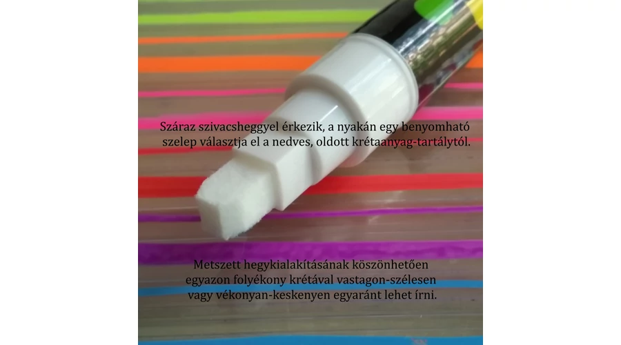 A folyékony kréta különösképp alkalmas „fényes", lakozott felületekre történő íráshoz - a hagyományos tábla mellett tehát a fehér táblákra*, fára, műanyagra, üvegre, akár fémre is lehet vele írni. A hegye metszett, így szélesen-vastagon és keskenyen-vékonyan egyaránt írhatsz vele (vendéglőkben, kocsmákban is gyakran folyékony krétával viszik fel a napi kínálatot a palatáblákra, mivel sokkal szebb vonalvezetést tesz lehetővé). *: fehér tábláknál nedves ronggyal / szivaccsal ajánlott letörölni, ami (mármint a gyülemlő, elmosódott krétafoltok) viszont hosszú távon konfliktust okozhat a táblafilccel - azonban a fehér tábla anyagát, felületét a folyékony kréta nem károsítja, így egyszer-kétszer azért kipróbálhatod rajta; nagy bajt nem okozhat.