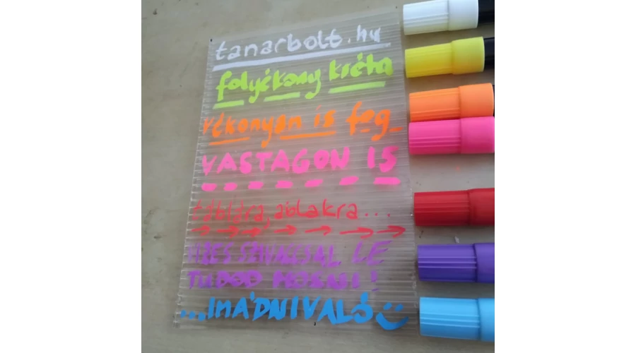 A folyékony kréta különösképp alkalmas „fényes", lakozott felületekre történő íráshoz - a hagyományos tábla mellett tehát a fehér táblákra*, fára, műanyagra, üvegre, akár fémre is lehet vele írni. A hegye metszett, így szélesen-vastagon és keskenyen-vékonyan egyaránt írhatsz vele (vendéglőkben, kocsmákban is gyakran folyékony krétával viszik fel a napi kínálatot a palatáblákra, mivel sokkal szebb vonalvezetést tesz lehetővé). *: fehér tábláknál nedves ronggyal / szivaccsal ajánlott letörölni, ami (mármint a gyülemlő, elmosódott krétafoltok) viszont hosszú távon konfliktust okozhat a táblafilccel - azonban a fehér tábla anyagát, felületét a folyékony kréta nem károsítja, így egyszer-kétszer azért kipróbálhatod rajta; nagy bajt nem okozhat.